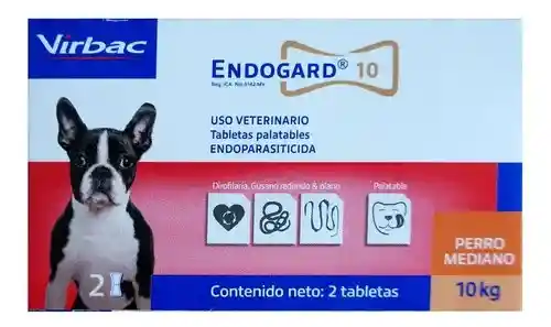 Endogard 10 (caja x 2 tabletas) es un antiparasitario interno de amplio espectro para perros, indicado para tratar y controlar nemátodos (gusanos redondos), céstodos (tenias), giardias y microfilarias del gusano del corazón. Está formulado para perros medianos, con 1 tableta recomendada por cada 10 kg de peso.