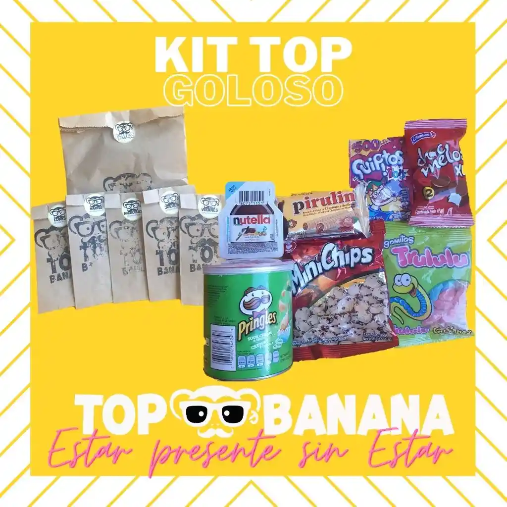 endulza la semana con esta espectascular sorpresa... tu decides si se empaca como experiencia semanal o como una unica sorpresa, trae 1 nutella x 15g, 1 quipitos pops x 8g, 1 minichips x 35g, 1 pirulin de 4unds x 24g,1 paquete gomitas trululu sabor a escoger entre aros, fresitas, gusanitos o sabores x 30g, 1 chocmelos XL 2unds x 19g, 1 pringles sabor a eleccion entre crema y cebolla, queso cheddar o original x 40g