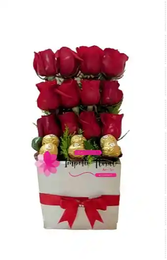 hermoso detalle x 12 rosas de exportacion + 8 chocolates (color disponible de la base en negro ) + tarjeta mensaje