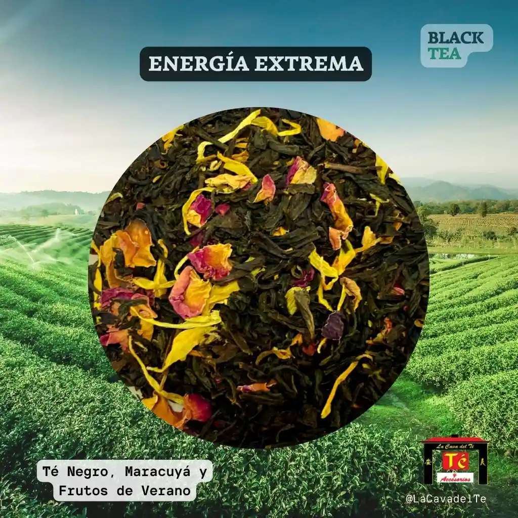 Mezcla de Té Negro, Maracuyá y Frutos de Verano. Esta mezcla es ideal para aquellos que buscan una opción vigorizante y deliciosa, perfecta para iniciar el día con pasión o para recargar energías en cualquier momento.