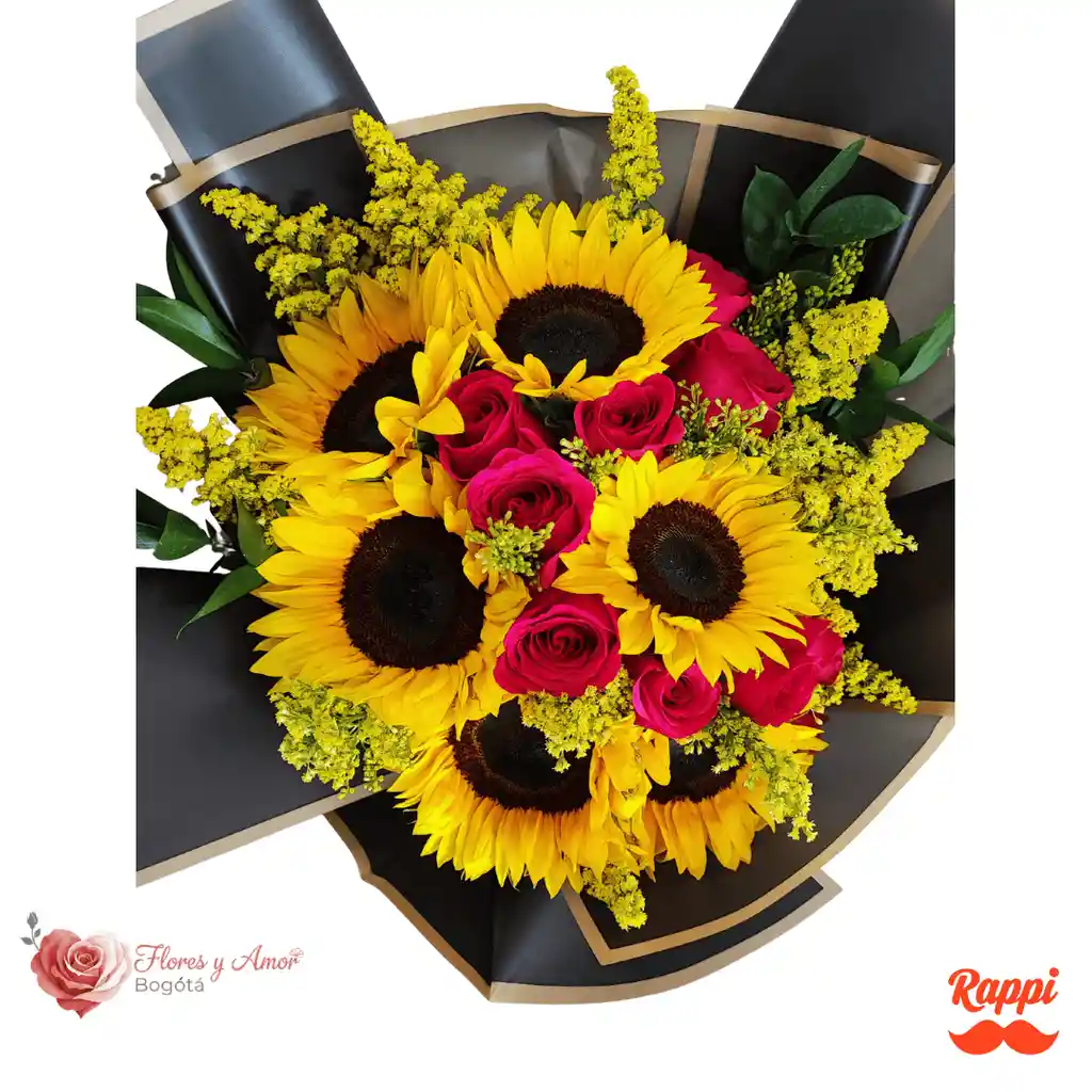 Seis girasoles protagonistas llenan el arreglo de luz y presencia, acompañados por rosas fucsia que aportan intensidad y contraste. El solidago en abundancia crea una textura vibrante y envolvente que hace que el bouquet se vea grande, dinámico y muy llamativo. Es una combinación poderosa, moderna y alegre, perfecta para regalar un detalle que transmite energía, carácter y un impacto visual inolvidable, ideal para fotos de catálogo y para sorprender a primera vista.