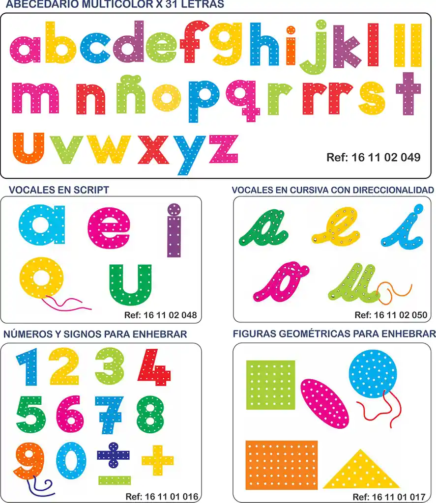 Lecto-escritura, lenguaje y pensamiento matemático: Ayuda al reconocimiento de los grafemas, fonemas, formas y números. Direcciona el trazo correcto de las vocales en cursiva, permite dibujar y copiar las letras y números. Desarrolla la habilidad de cosido que hace que los movimientos de la mano sean mas precisos y ágiles. Área: percepción visual, táctil, coordinación viso-motora. Planeamiento motor fino. Lenguaje, pensamiento matemático.
