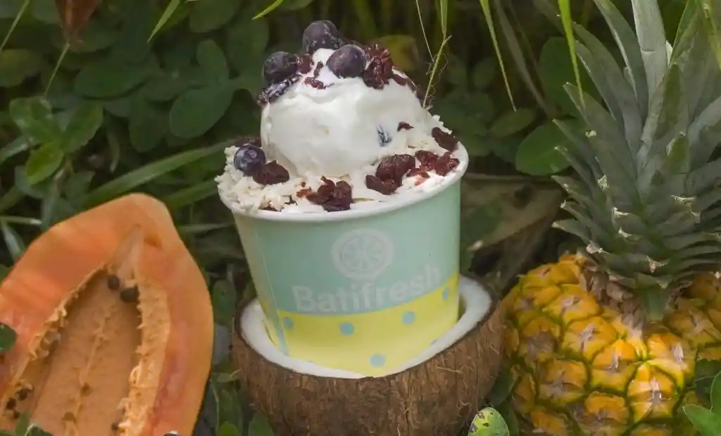 Ensalada de: Piña, papaya, banano, fresas, uvas, helado, queso, kumis y arándanos