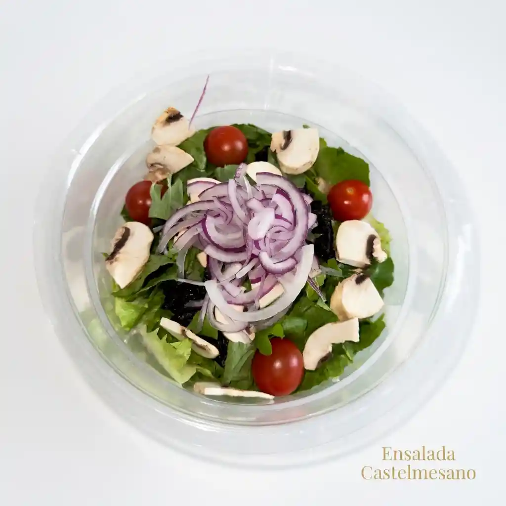 Ensalada de Lechuga Romana , Tomate deshidratado , tomate Cherry , Albahaca, champiñones, Cebolla Roja , queso Feta , láminas de maíz horneadas . Salsas vinagre de modena y salsa pesto