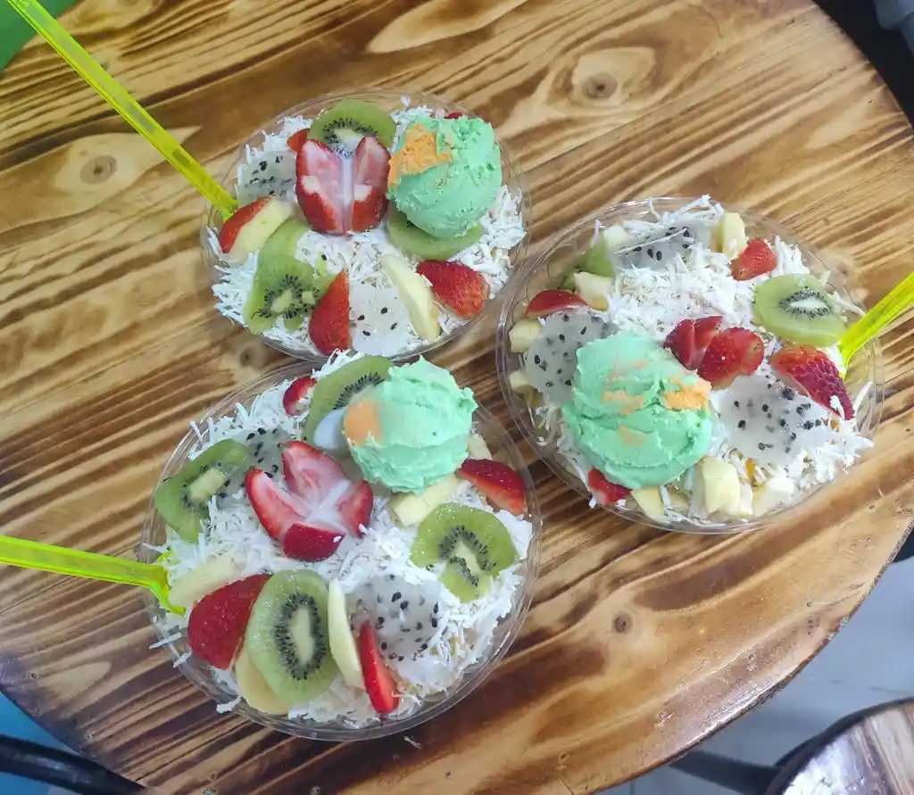 Deliciosa Ensalada de Frutas Viñedo servida en bowl de 22 oz, preparada con una mezcla de frutas frescas como papaya, melón, fresa, banano y otras frutas de temporada. Acompañada de crema de leche, queso rallado, barquillo y salsa de mora o al gusto. Un postre artesanal, natural y refrescante, ideal para disfrutar en cualquier momento del dí