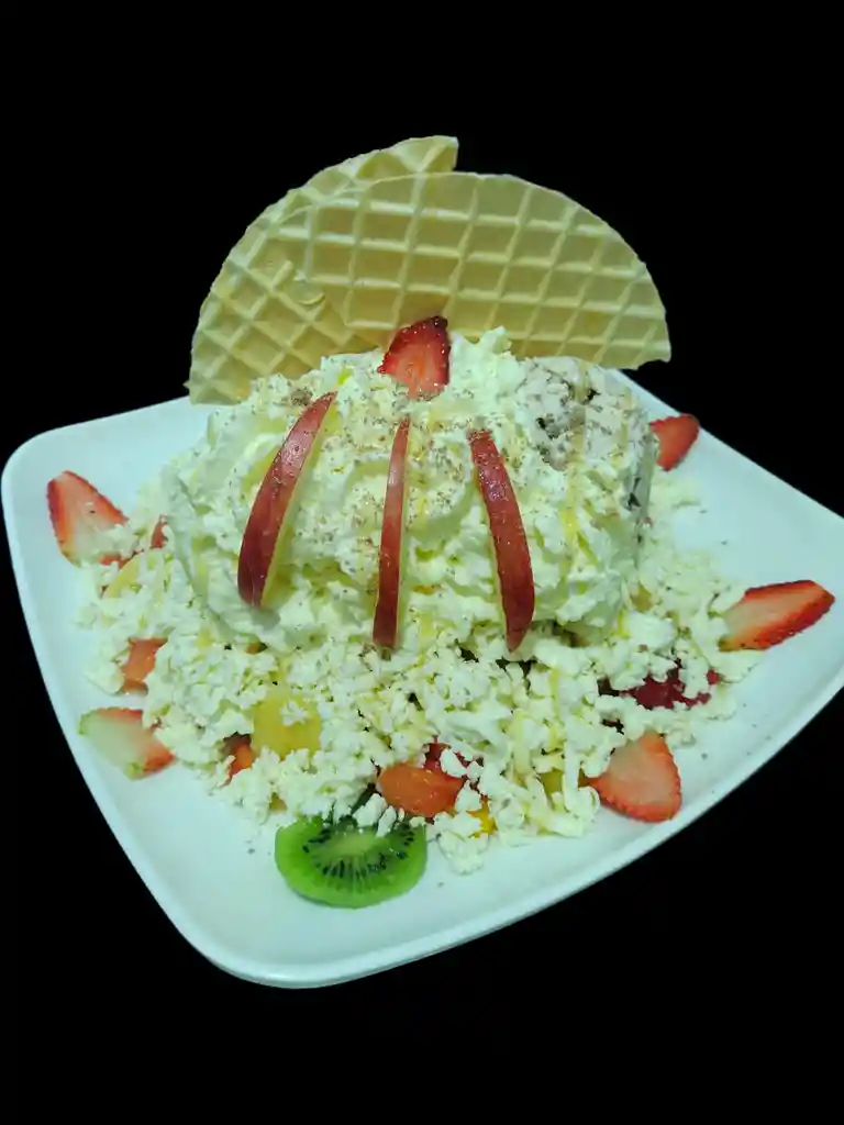 MEZCLA DE FRUTAS PAPAYA,MANGO,SANDIA,PIÑA,BANANO,MANZANA,FRESA,KIWY,ACOMPAÑADO DE QUESO RAYADO,CREMA CHANTILLY Y LECHE CONDENSADA. UNA BOLA DE HELADO.