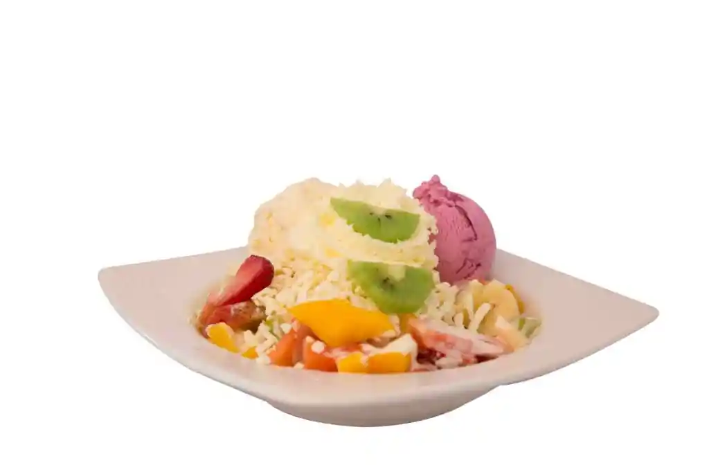 Mezcla de frutas frescas (banano, manzana, pera, fresa, mango, piña, papaya y melón), bañadas en crema de leche o yogurt, acompañadas de queso, una bola de helado y crema chantilly.