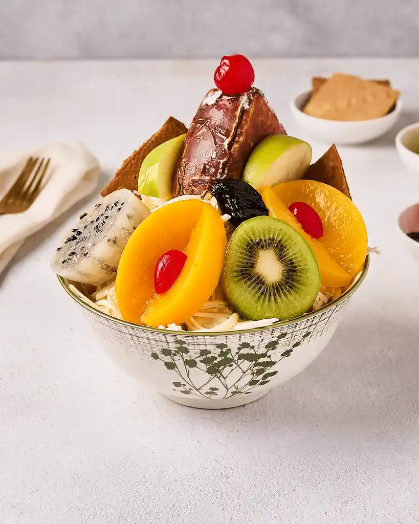 Combinación de 7 clases de fruta picadas, queso campesino, crema de leche de la casa, helado en platillo y decorada con dos porciones de durazno, una de pitaya, kiwi, cereza y manzana
