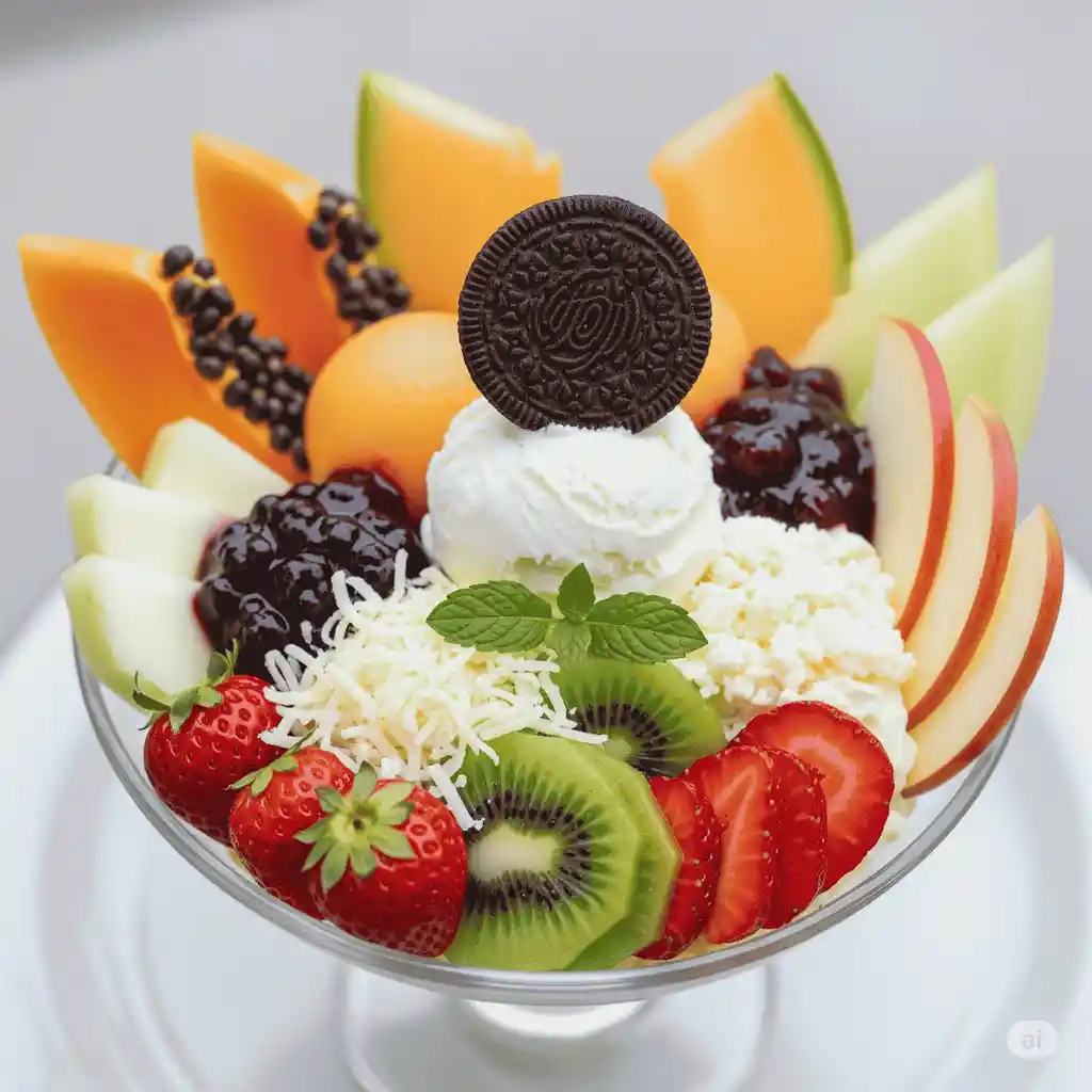 Deliciosa ensalada de frutas hecha de papaya, melon, 1 bola de helado, galleta, fresa, kiwi, salsa de mora, queso rayado, manzana y crema de leche