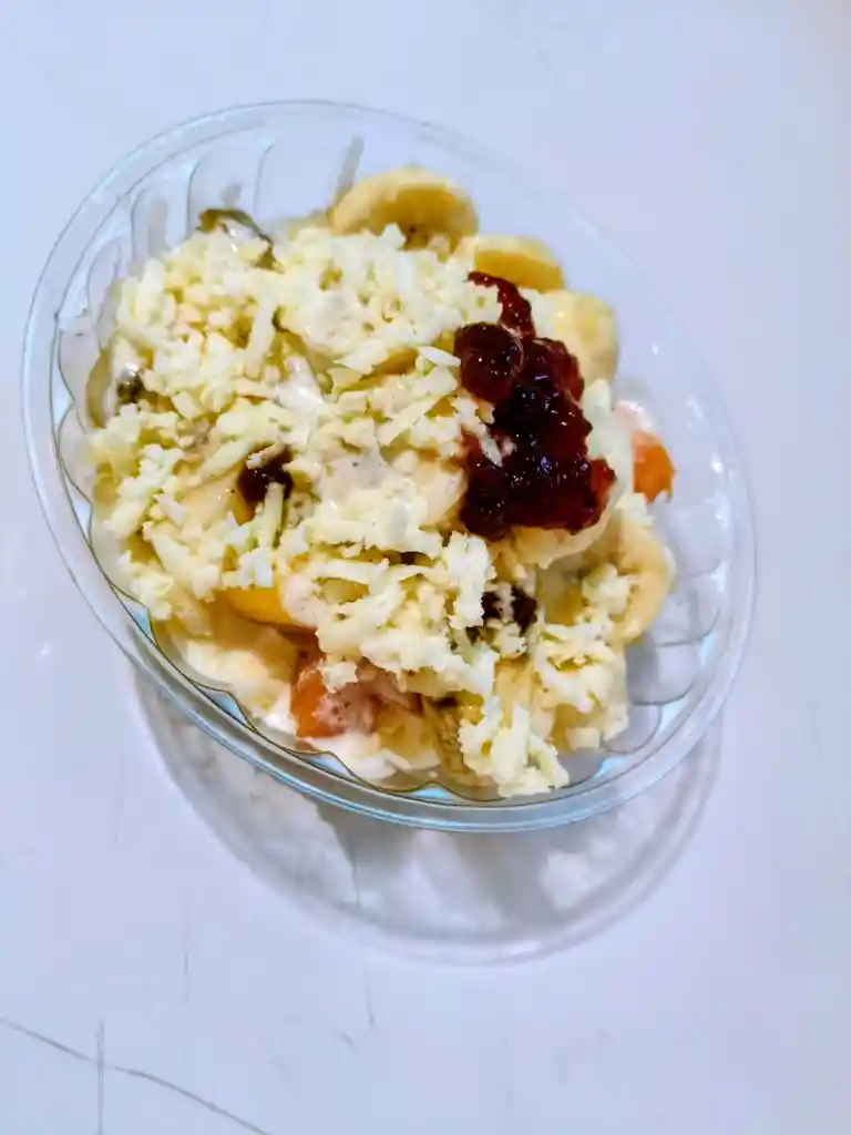 ENSALADAS DE FRUTAS CON CREMA DE LECHE,RAYADURA DE QUESO Y SALSA DE FRUTA