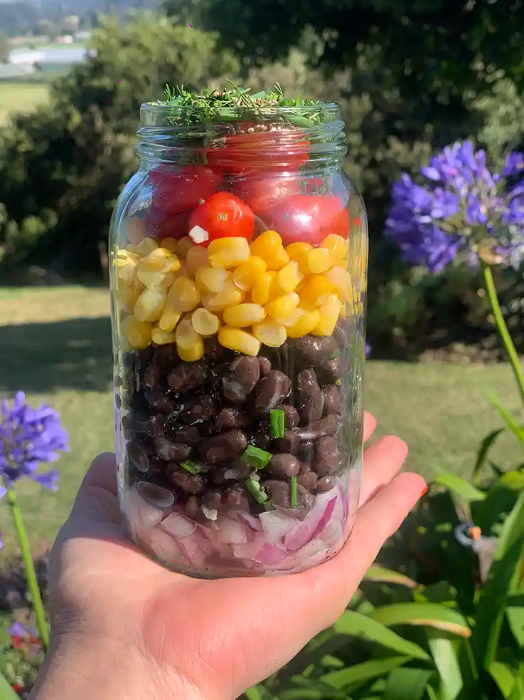 Delisiosa jar salad lista para servir, con el mejor mix del campo, vegetales 100% orgánicos y frescos, cebolla roja, frijol negro, maíz, tomate cherry, cilantro y cebollín, incluye aderezo de la casa.