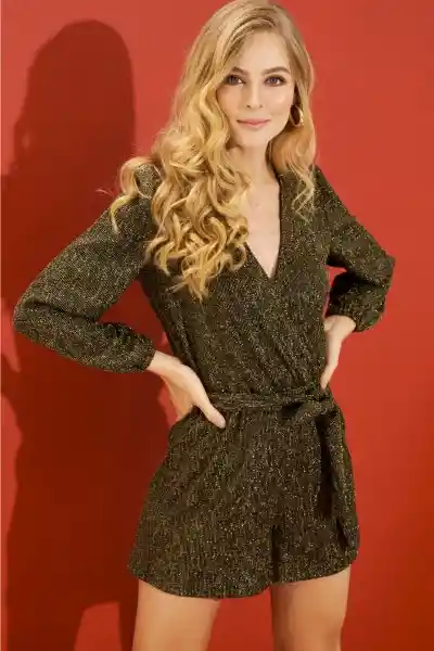 Corto Tejido de Punto Con Lurex Escote Cruzado en V Manga Larga Con Elástico en Ruedo Cinturón en la Misma Tela.