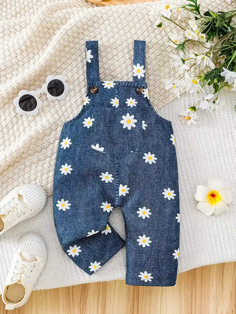 Hermoso enterizo para bebé en talla 6 a 9 meses, elaborado en tela suave tipo denim ligero que brinda comodidad y libertad de movimiento durante el día. Este producto incluye: Enterizo largo color azul tipo jean con tirantes y botones frontales Estampado de flores blancas tipo margaritas en todo el diseño Perfecto para uso diario, salidas casuales o sesiones de fotos, ofreciendo un estilo fresco, cómodo y moderno para el bebé.