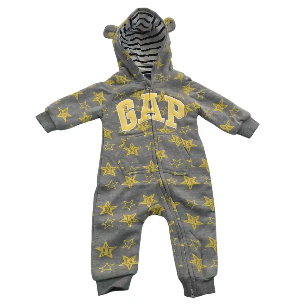 Enterizo Bebé Gris con Estampado de Estrellas Amarillas 6-12 Meses, Forrado con Capucha Doble y Cierre en Cremallera