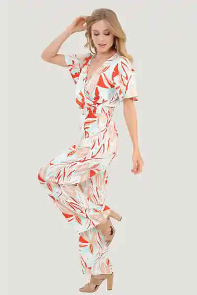 Largo en Chalis Estampado Escote Cruzado en V Con Botón Interno Elástico en Cintura Manga Corta Amplia Bolsillos Bota Recta.