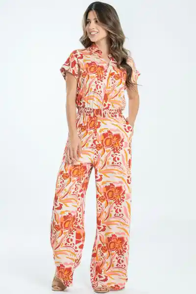 En Chalis Estampado Con Cuello Camisero y Media Perilla Manga Sisa Resortado en Cintura Bolsillos Laterales Pierna y Bota Amplia.
