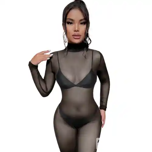 Enterizo completo de malla transparente Color negro Manga larga y cuello alto Ajuste ceñido al cuerpo Tela elástica, ligera y cómoda Diseño minimalista y sofisticado 🔥 Ideal para fiestas nocturnas, outfits urbanos, eventos especiales, shows, sesiones fotográficas o looks fashion de alto impacto. TALLA UNICA