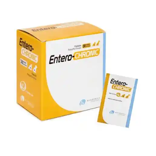 Entero-Chronic es un alimento complementario para perros y gatos que ayuda al correcto funcionamiento intestinal. indicado en alteraciones intestinales crónicas o recurrentes. Ayuda a restablecer el epitelio intestinal y a mejorar la función defensiva y digestiva del intestino. Contiene: alfa-glucano butirogénico, una sustancia que produce butirato, la principal fuente de energía de las células epiteliales del intestino, que ayuda a renovar y reparar la mucosa. También interviene en la protección contra el estrés oxidativo y en la modulación de la inflamación local. mucopolisacáridos actúan reforzando las mucinas del intestino, para modular la inflamación y prevenir la adhesión de bacterias patógenas. beta-glucanos y manano-oligosacáridos nutren las bacterias beneficiosas, de manera que es posible evitar el desarrollo de microorganismos patógenos. - Alimento complementario para perros y gatos - Alteraciones intestinales de larga duración en perros y gatos, - Cuando se administran antibióticos o fármacos de manera prolongada, o por otros motivos. Indicaciones Reacciones inmunomediadas y enfermedad inflamatoria intestinal Diarreas ocasionadas por antibióticos y tratamientos prolongados con antibióticos. Infecciones víricas, bacterianas, fúngicas o protozoarias Disfunciones crónicas de órganos asociados al tracto gastrointestinal, como insuficiencia hepática o insuficiencia pancreática exocrina Insuficiencia renal crónica Alergias o hipersensibilidades alimentarias Toxinas y fármacos (AINEs, agentes citotóxicos-quimioterápicos) Hipoxia e isquemia Trastornos de la permeabilidad intestinal: enteropatía con pérdida de proteínas y síndrome del intestino permeable