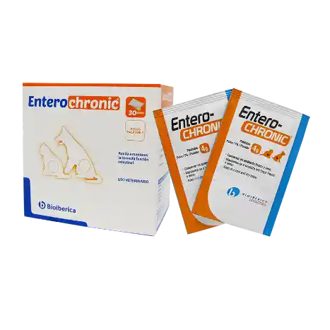 Entero-Chronic® es un alimento complementario que ayuda a mantener las funciones intestinales. Se recomienda como soporte en casos de alteraciones intestinales de larga duración en perros y gatos, como las que se producen cuando se administran antibióticos u otros fármacos de manera prolongada, o por otros motivos.