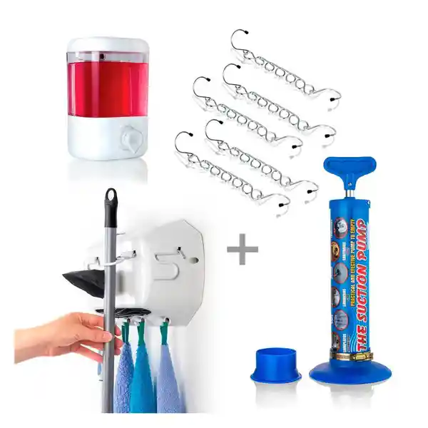 Gran combo para el mantenimiento del hogar.Bomba de Succión ideal para destapar cañerías. lavaplatos. desagües. lavamanos. etc. Posee 40 libras de presión al vacío que le permite extraer cualquier objeto que obstruya las cañerías.Es ideal para secado de ropa en espacios reducidos.5 ganchos para ahorrar el 60% de espacio para colgar ropa y accesorios en el closet.Resiste hasta 20 libras de peso (9kg).Portaescobas adecuado para optimizar tus espacios y mantener en orden tus implementos de aseo.En este innovador organizador. podrás colocar de forma cuidadosa tus escobas. traperos. trapos o paños.Lograrás acceder a tus bolsas plásticas de forma rápida y práctica cuando las necesites. Tiene espacio para 4 escobas o traperos y hasta 4 trapos.Dosificador de líquido recargable. fácil de instalar.Perfecto para el gel antibacterial y alcohol.Ideal para el hogar. la oficina. hospitales. negocios. etc.Práctica válvula dosificadora patentada que le permite ahorrar hasta el 50% del líquido.