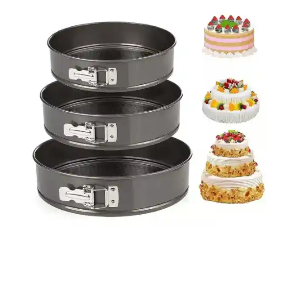 Set x3 Moldes Desmontables Teflón Torta Redondo Repostería Características: Tres moldes desmontables de teflón para repostería Medidas Diámetros: 18cm, 20cm , 22cm Diámetro x 6,5cm Alto Material: Acero al carbón antiadherente Color: Negro