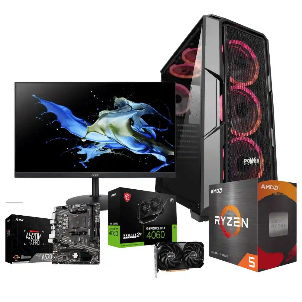 1. VELOCIDAD Y RENDIMIENTO SIN INTERRUPCIONES El AMD Ryzen 5 5600GT , garantiza fluidez en juegos exigentes, edición de contenido y multitarea intensiva. 2. GRÁFICOS INMERSIVOS Y DETALLADOS La GeForce RTX 4060 Ventus 2X Black 8GB OC ofrece un desempeño gráfico excepcional con trazado de rayos y DLSS para imágenes más realistas. 3. CARGA RÁPIDA Y GRAN CAPACIDAD El SSD M.2 SATA de 512GB permite inicios instantáneos, tiempos de carga mínimos y almacenamiento óptimo para juegos y software. 4. EXPERIENCIA VISUAL SUPERIOR El monitor Acer de 21.5” IPS proporciona colores vibrantes, gran nitidez y ángulos de visión amplios para una inmersión total. 5. DISEÑO ROBUSTO Y COMPONENTES DE CALIDAD Caja ATX Power Group L23 con excelente flujo de aire, fuente de 600W 80 Plus Bronce y combo de teclado y mouse para un setup completo.