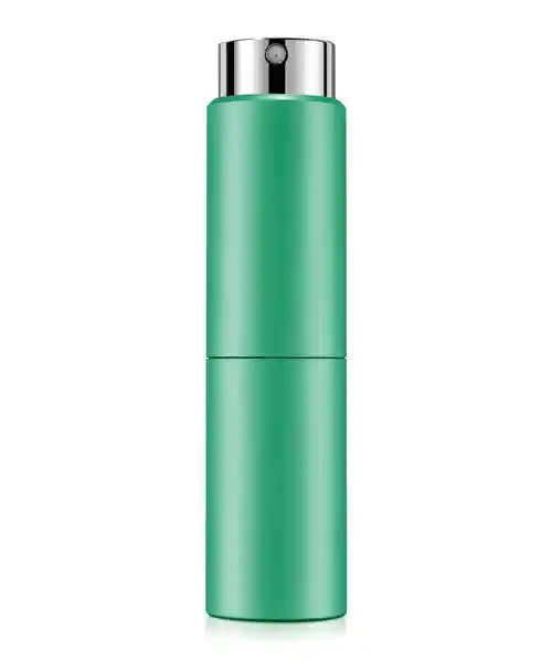 Atomizador Con Apertura en Formato Twist Realizado en Aluminio Lacado en Color Verde Mate Con Spray en Color Plata Con el Logo Equivalenza Serigrafiado en Color Gris. Frasco Interior de Vidrio Con Capacidad Para 15 mL. Medidas: 10 cm Alto x 27 cm de Diámetro.