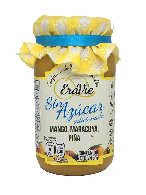 Eravíe confitura de frutos amarillos mango maracuyá y piña sin azúcar presentación en frasco con 245 g. Packing: Frasco