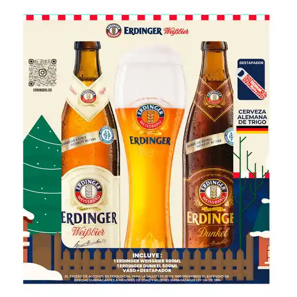 Contiene 4 Unidades. Erdinger Cerveza Alemana Estuche 2 Unidades de 500 mL c/u + Copa 1 Und + Destapador 1 Und.