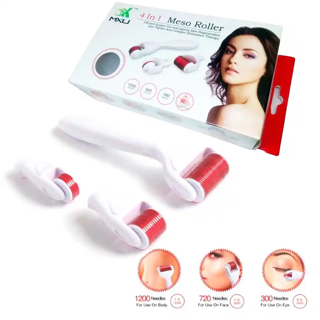 Tratamiento para acné. Suaviza de cicatrices de cirugías, cicatrices de quemaduras y espinillas. Elimina las marcas en la piel, disminuye las estrías. Excelente método anti envejecimiento, gracias a que estimula la producción de colágeno. Recuerde que la producción de colágeno lleva varios meses de punción cutánea antes de ver ninguna diferencia real. Ten paciencia y los resultados vendrán. Suaviza líneas de expresión, arrugas y ojeras. Mejora la elasticidad de la piel y la reafirma. Reduce el tamaño de los poros, elimina las manchas en la piel. Estimulación del cuero cabelludo, para problemas de alopecia. Meso Roller 4 en 1 Rejuvenecimiento Regenerador Facial Agujas Antiarrugas. Sistema de rodillos de agujas en titanio micro de excelente calidad. gracias a que estimula la producción de colágeno. Recuerde que la producción de colágeno lleva varios meses de punción cutánea antes de ver ninguna diferencia real. Ten paciencia y los resultados vendrán. Una herramienta anti envejecimiento eficaz que reduce los signos comunes de envejecimiento, como arrugas, hendidura facial, etc. Promueva la circulación sanguínea y haga que su piel se apriete, elástica y efectivamente mejorar la cicatriz, estrías, acné, etc. ESPECIFICACIONES: Sistema de rodillos de agujas en titanio DermaRoller 0.50mm DermaRoller 1.00mm: DermaRoller 1.50mm