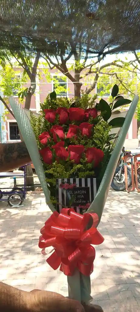 ramillete de rosas en cascada con follaje envuelto en papel coreano moño y tarjeta