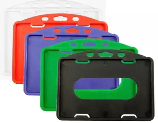 La escarapela horizontal, también conocida como porta-carnet o porta-distintivo, es un accesorio de identificación diseñado para proteger y exhibir tarjetas de manera horizontal (apaisada). Es el estándar más utilizado en eventos corporativos, ferias y oficinas