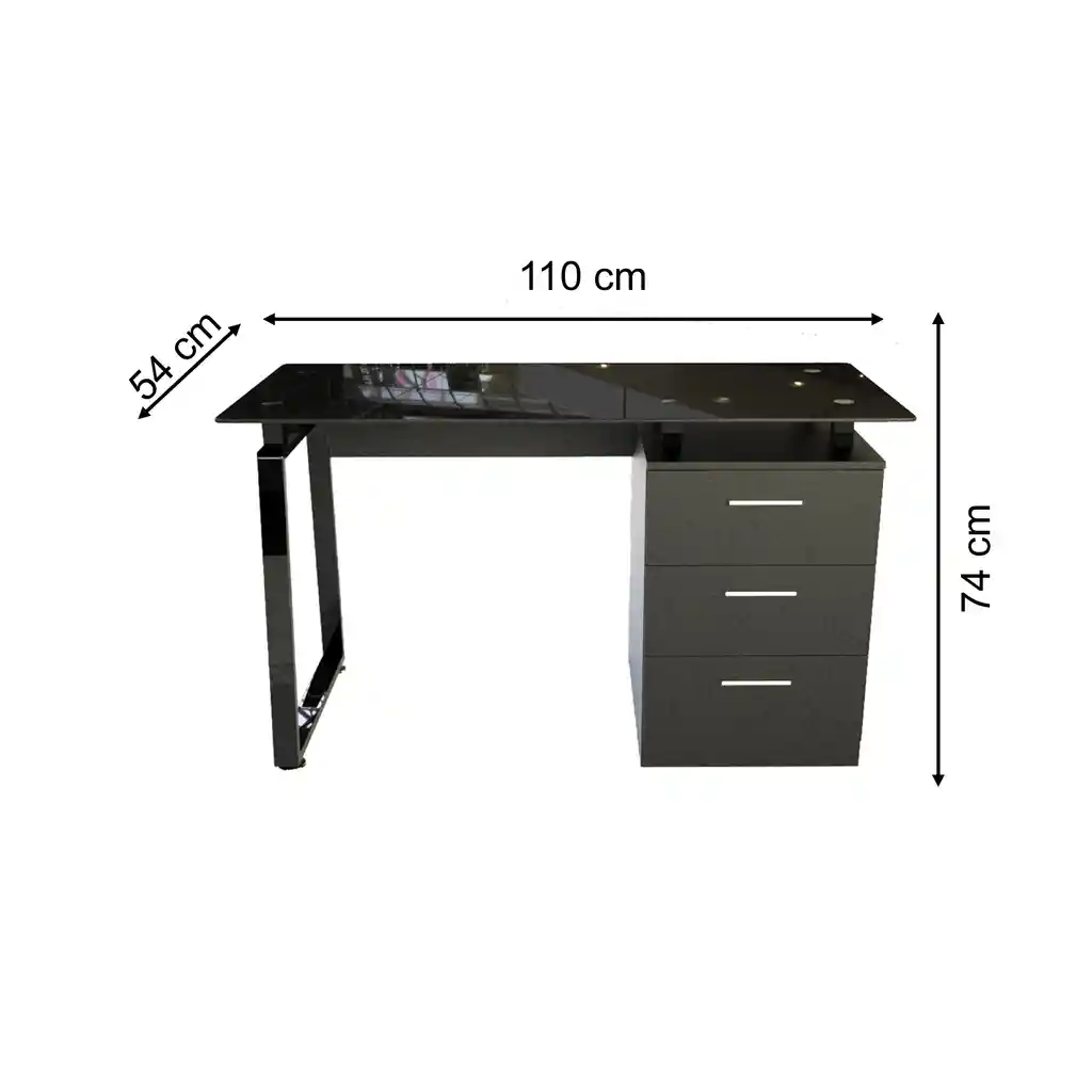 Escritorio secretarial, Estructura metálica con pintura electrostática, Superficie en vidrio Templado de 8 mm, cajonera triple en madera , Ergonómico, Fácil armado, Diseño que garantiza estabilidad y durabilidad, Ideal para oficina y hogar. MEDIDAS: ALTO 74 / ANCHO 110 / FONDO 54 GARANTIA 24 MESES