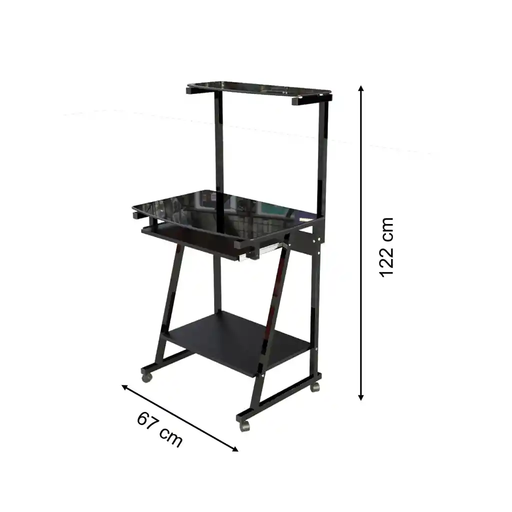 Escritorio auxiliar, estructura metálica con pintura electrostática, superficie en vidrio templado 8 mm, porta teclado extraíble, ruedas en polipropileno, ergonómico, fácil armado, diseño que garantiza estabilidad y durabilidad, espacio adicional para papeles/libros, ideal para oficina y hogar. MEDIDAS: ALTO 122 / ANCHO 67 / FONDO 46 GARANTIA 24 MESES