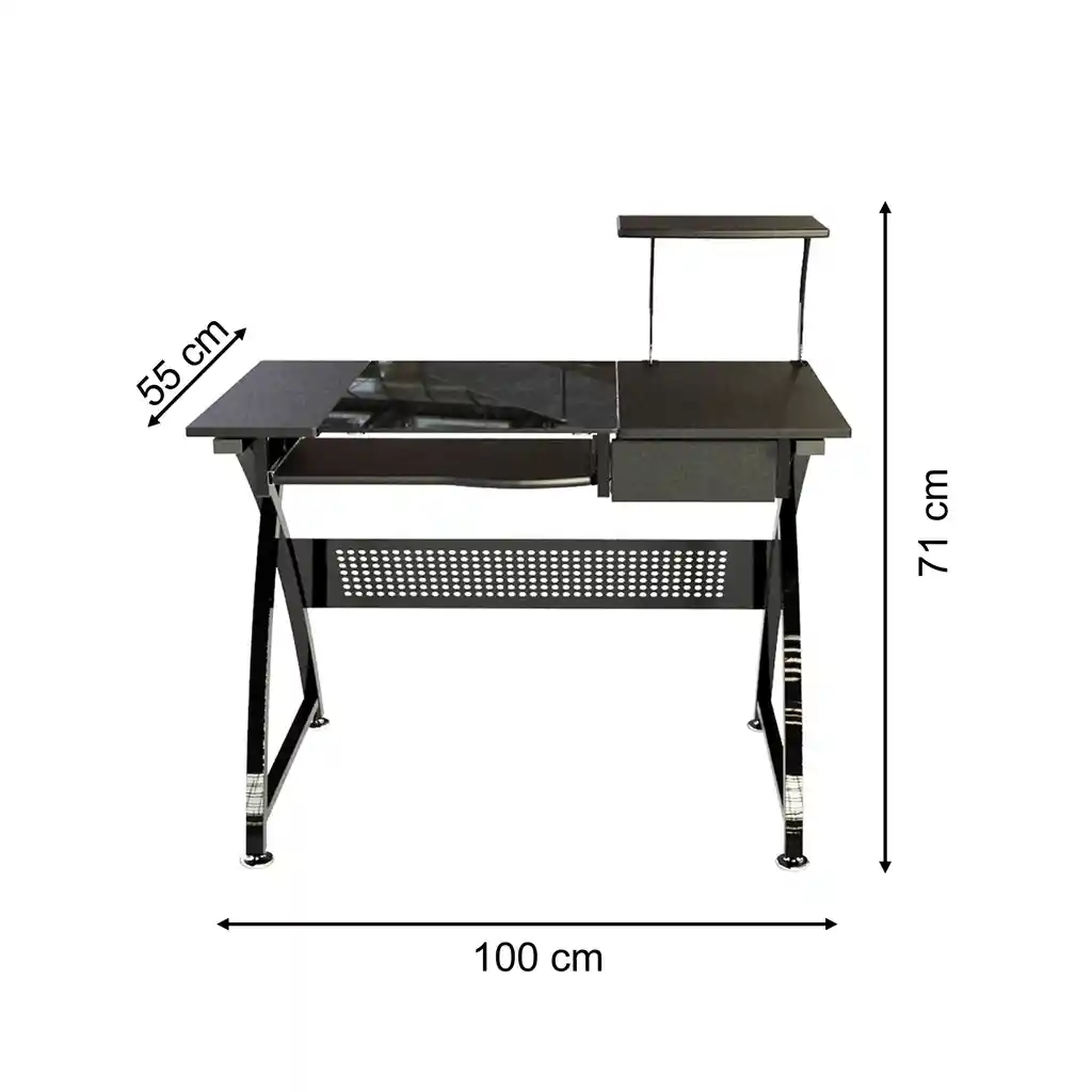 Escritorio secretarial superficie en Vidrio templado y madera mdf con gaveta y base para impresora, cpu en madera. estructura metálica con pintura electrostática negra, Tapa falda para mayor comodidad, niveladores para mayor adherencia al piso. MEDIDAS: ALTO 71 / ANCHO 100 / FONDO 55 GARANTÍA 24 MESES