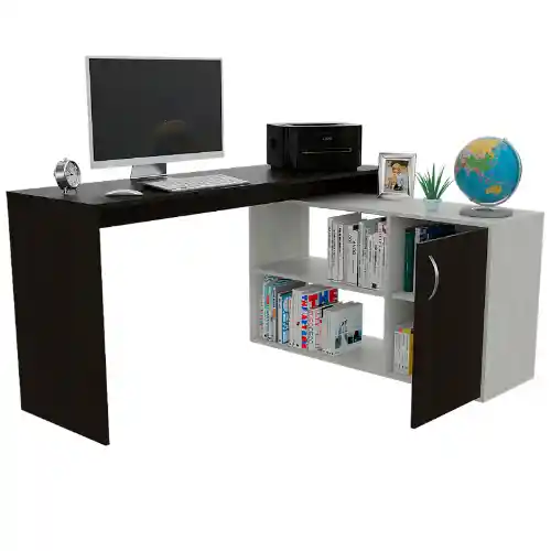 Crea la zona de estudio o trabajo que tu hogar necesita. Encuentra los diseños más novedosos, cómodos y que se adaptan a cualquier espacio de tu casa. Escritorio en L, con espacio con puerta batiente para almacenar libro u otro, y compartimiento para objetos de estudio o decorativos. Elaborado en Madera aglomerada MDP, recubierta con láminas melamínicas de excelente calidad, en color Wengue y Blanco Artiko. Sus medidas son: Alto: 76,5 cm Ancho: 151,5 cm Fondo: 116,5 cm El tiempo de entrega de este producto es de 3 a 8 días hábiles. Su garantía es de 5 años en madera y 1 en herrajes. Importante: Este producto no incluye elementos decorativos ni ambientación.