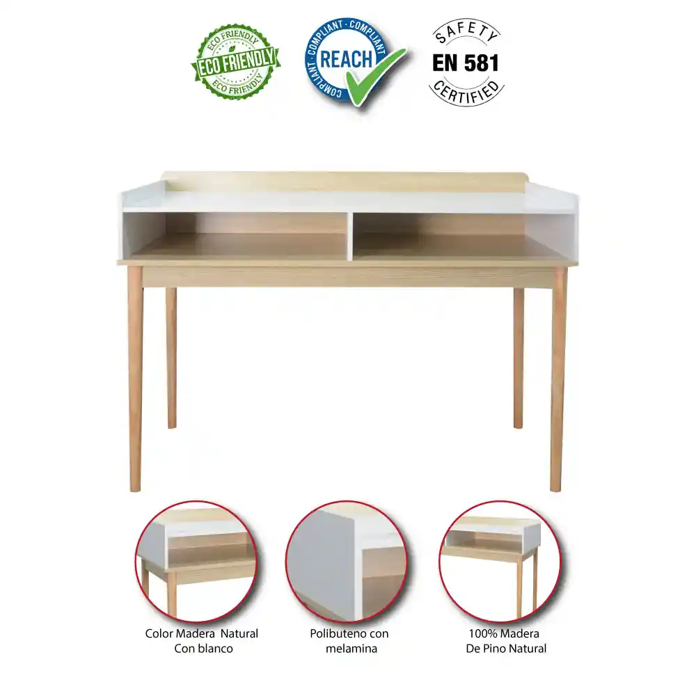 Mesa Quipile, Dale un toque personal a tu casa u oficina. Indicada especialmente para espacios interiores como recibidores, pasillos, comedores o habitaciones. Se integra a la perfección en oficinas o estudios con un aire actual gracias a su diseño atractivo y funcional. Su combinación de líneas sencillas y colores suaves, la convierten en el complemento perfecto. Esta pieza de diseño de última tendencia en decoración está compuesta de dos amplios organizadores y una estructura que proporciona una superficie estable y resistente en la que apoyar lámparas, libros y todo tipo de accesorios, soportando una carga máxima de 50 Kg, y podrás incluso utilizarla como escritorio gracias a su amplio tablero. Un espacio ordenado y limpio fomenta la creatividad y la concentración, así que mantén tu espacio organizado y ponte manos a la obra en tus jornadas de trabajo. Esta mesa consola de diseño nórdico es el complemento que buscas. Una pieza decorativa, funcional, resistente y ecológica. Su fabricación en madera maciza la hace resistente y duradera. Su montaje es sencillo, por lo que la tendrás lista en apenas unos minutos. En cuanto a su limpieza, te recomendamos que elimines el polvo y manchas de su superficie con una gamuza seca. Evita siempre el uso de productos químicos que puedan dañarla, la madera se mantendrá como el primer día. Déjate cautivar por la sencillez y elegancia del estilo escandinavo.
