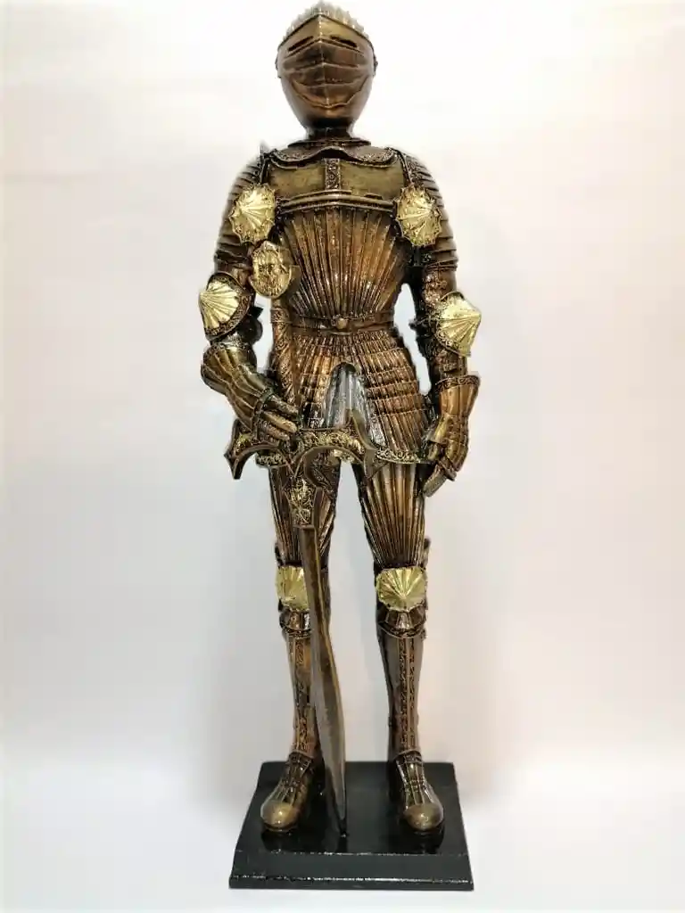 Escultura realizada en resina por artesanos colombianos y trabajada en una técnica de pintura a mano, conocida como envejecida.