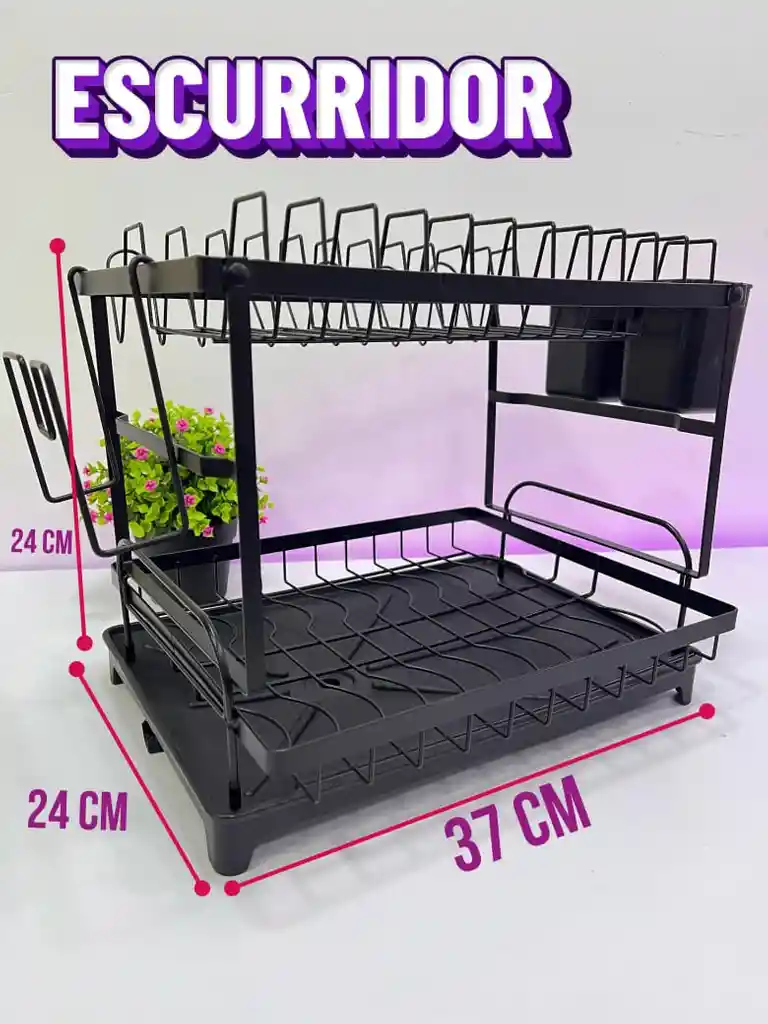 Esta elegante y versátil bandeja de encimera presenta una elegante y versátil estructura de metal con amplio espacio para secar los platos y guardar los utensilios; cuenta con 2 niveles para secar platos, espacios personalizados para utensilios y tablas de cortar y ganchos adjuntos para pequeños utensilios de cocina o utensilios de cocina; se pliega fácilmente para ahorrar espacio de almacenamiento. Medidas Tamaño: 37*24*24cm