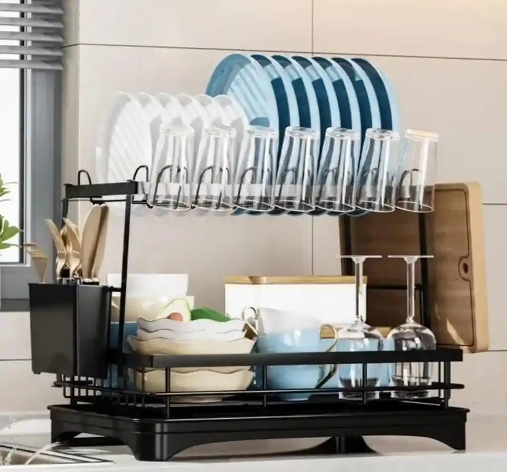 Este producto es un escurridor de platos de dos niveles Diseño: Cuenta con dos niveles para optimizar espacio, incluye una bandeja de drenaje extraíble y un soporte para cubiertos Material: construido en acero inoxidable con acabado en color negro. Funcionalidad: Diseñado para secar platos, vasos y utensilios, con un pico giratorio en la bandeja para dirigir el agua al fregadero Dimensiones: Las medidas aproximadas son 30 CM * 42 CM *30CM