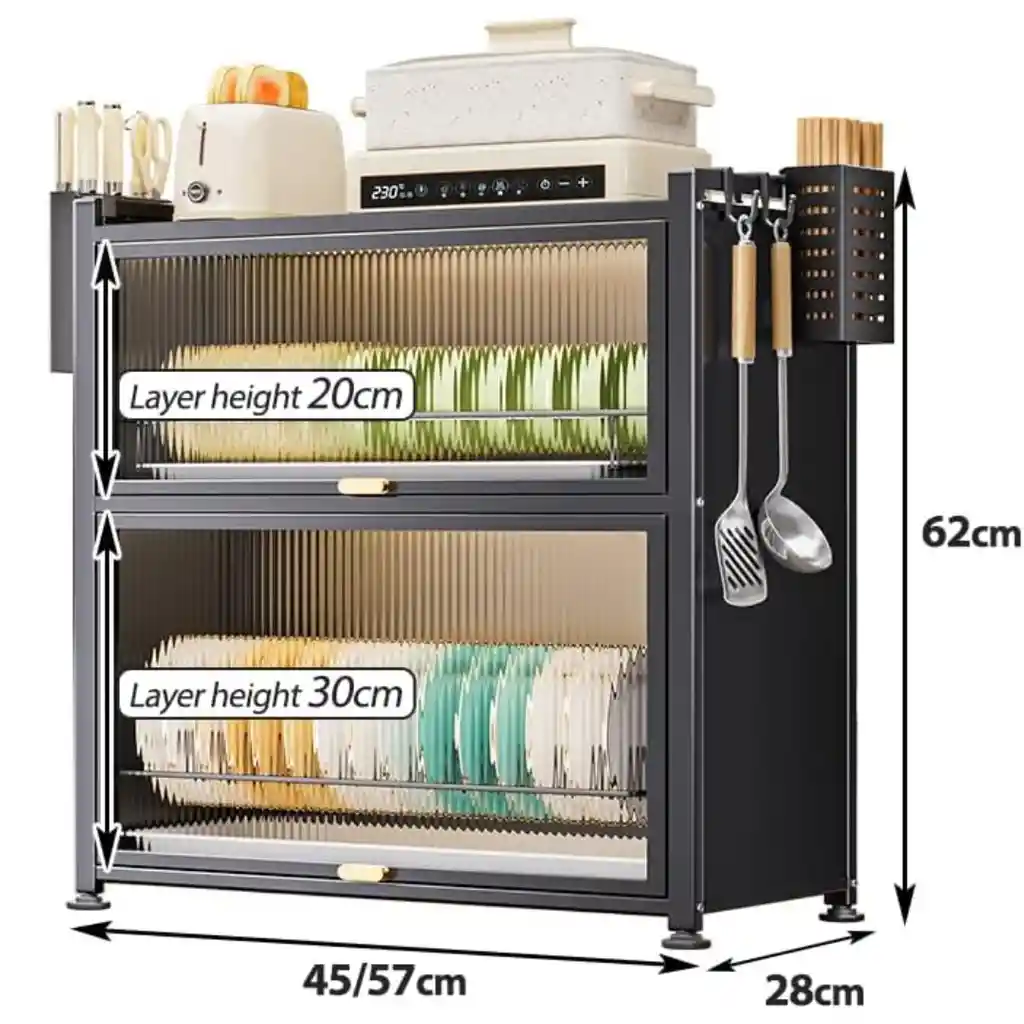 Funcionalidad, Estilo y Durabilidad en tu Cocina El Escurridor Gabinete Doble 56CM es la solución ideal para organizar la cocina sin perder espacio ni estilo. Su diseño doble ofrece practicidad, mientras que sus materiales de alta resistencia aseguran una larga vida útil. Especificaciones técnicas: Dimensiones generales: Alto: 61 cm Ancho: 28 cm Largo: 56 cm Peso: 7 kg Espacios internos: Superior: 22,5 cm de alto x 28 cm de ancho x 56 cm de largo. Inferior: 28 cm de alto x 28 cm de ancho x 56 cm de largo. Materiales: Acero al carbono para la estructura. Panel de puerta en plástico resistente. Ventajas principales: Organización eficiente: Permite guardar platos, ollas, tablas y cubiertos. Alta resistencia: Estructura firme y anticorrosiva. Diseño moderno: Estético y adaptable a cualquier cocina. Accesorios incluidos: Porta-cubiertos, porta-cuchillos y manual de montaje. Fácil mantenimiento: Superficie sencilla de limpiar y resistente al uso diario. Nota: Garantía de 30 días por defectos de fábrica. No cubre daños ocasionados por caídas, golpes o manipulación indebida.