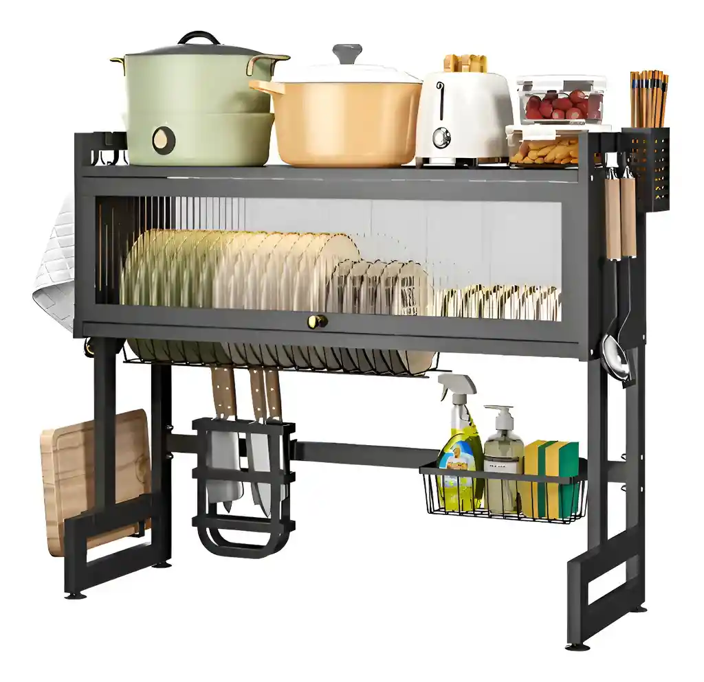 Estante para platos de 78,5 cm de alto y 65 cm de ancho. Capacidad para 8 platos en diseño vertical. Material de acero esmaltado para alta resistencia. Incluye escurridor de cubiertos removible para mayor organización. Diseño desmontable que facilita la limpieza y mantenimiento. Ventosas en la base garantizan estabilidad y evitan desplazamientos.
