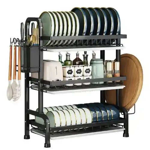 Escurridor de trastes - Dimensiones aproximadas de 42 L x 23,5 W x 61 H (cm). Incluye rejilla principal de tres capas, soporte para palillos, rejilla para cuchillos y rejilla para tabla de cortar. Capacidad para almacenar platos, vajillas, botellas de condimentos, tablas de cortar, cuchillos y otros utensilios de cocina. Estructura escurridor - Diseño en forma de T con barra de soporte gruesa y pies giratorios ajustables en la parte inferior para controlar la altura y proporcionar estabilidad, evitando balanceo. Capacidad de soporte de hasta 120 libras. Escurridor de trastes acero inoxidable - Acabado con pintura de poliéster para hornear, ofreciendo protección multicapa, resistencia al desgaste y a la suciedad. Superficie de pintura lisa y resistente a la decoloración. Escurridor de trastes fácil limpieza - Rejilla del tazón curvo desmontable para una limpieza sencilla. Cada capa cuenta con una bandeja receptora de agua de material pp, evitando ensuciar la encimera. Libere espacio en la cocina - Diseño vertical que permite almacenar una mayor cantidad de vajilla, optimizando el espacio y contribuyendo a un entorno más organizado.