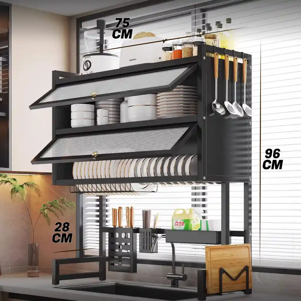 Primer nivel: escurridor | Segundo nivel: organizador de platos y vasos. Color: Negro elegante, que aporta un estilo moderno a la cocina. Diseño 2 niveles: Mayor capacidad para organizar platos, tazas, vasos y utensilios. ✅ Cubierta frontal: Puertas abatibles que protegen los platos del polvo y mantienen la limpieza. ✅ Accesorios laterales: Ganchos para cucharones, porta cuchillos, porta tablas de picar y espacio para detergente/esponja. ✅ Fácil limpieza y montaje. ✅ Material: Acero reforzado. medidas:75cm-96cm-28cm