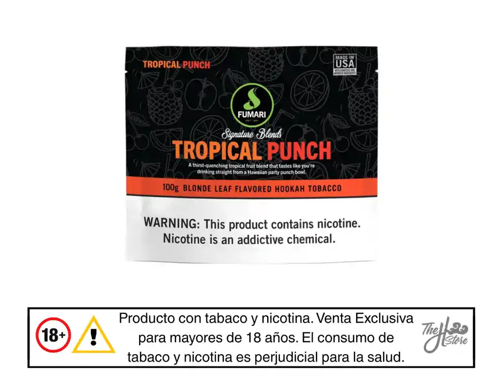 Sabor a mezcla de frutas tropicales, piña, cereza, limón, naranja y manzana. Producto elaborado a base de hojas de tabaco procesadas, glicerina vegetal y aromatizantes, con contenido de nicotina, diseñado para uso en Hookah, Shisha, Narguile, Arguile mediante calentamiento. Modo de uso: Colocar una cantidad adecuada de producto en la cazoleta (bowl) de la hookah. Cubrir con papel aluminio o utilizar un gestor de calor. Aplicar calor mediante carbón, de acuerdo con la preparación habitual del usuario. Condiciones de almacenamiento: Conservar en un lugar fresco y seco, alejado de la luz directa y de fuentes de calor. Mantener el envase bien cerrado después de su uso. Advertencias: Producto con tabaco y nicotina. Venta exclusiva para mayores de 18 años. El consumo de tabaco y nicotina es perjudicial para la salud. Mantener fuera del alcance de niños y mascotas. La venta y consumo están regulados por la normativa vigente.