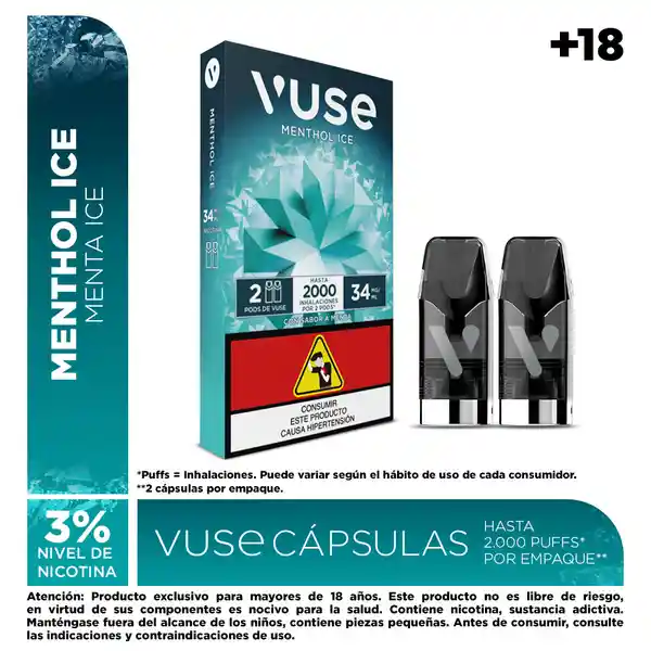 "Atención: Producto exclusivo para mayores de 18 años Este producto no es libre de riesgo, en virtud de sus componentes es nocivo para la salud. Contiene nicotina, sustancia adictiva. Manténgase fuera del alcance de los niños, contiene piezas pequeñas. Antes de consumir, consulte las indicaciones y contraindicaciones de uso. Desde el 21 de julio de 2025 productores e importadores estarán obligados a comercializar sus productos con los pictogramas y advertencias sanitarias establecidas por el Ministerio de Salud. Por lo anterior, coexistirán en los puntos de venta y/o entregas a domicilio empaques de producto con o sin advertencia sanitaria, hasta que estos últimos sean comercializados en su totalidad. La presente comunicación se publica en cumplimiento de lo dispuesto en los artículos 3 (numeral 1.3) y 23 a 28 del Estatuto del Consumidor (Ley 1480 de 2011), suministra información clara, suficiente, veraz y oportuna. El contenido aquí publicado no tiene fines promocionales ni publicitarios.Ingredientes: glicerina vegetal, propilenglicol, saborizante artificial de menta, nicotina (sustancia adictiva y nociva para la salud), ácido láctico, agua, alcohol bencílico y l-carvona. Empaque con 2 Pods de Vuse. Cont. Net. de cada pod: 2 ml. de líquido vaporizable. Contenido de nicotina por ml de líquido vaporizable: 34 miligramos por mililitro; equivalente al 3% del contenido neto del pod. "