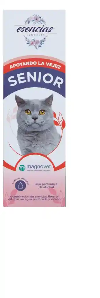 Apoya el proceso de envejecimiento para que sea armonioso tanto a nivel físico como psicológico/comportamental; teniendo en cuenta las principales enfermedades y los trastornos del comportamiento asociados al envejecimiento. Etapa Adulto Composición y/o Material Agua purificada y alcohol (15% por volumen), con extractos diluidos de flores.- Prunus amygdalus, Symphytum officinale, Carpinus betulus, Arnica montana y otras esencias complementarias. Libre de aditivos artificiales. Recomendación de uso Conservar en lugar fresco y seco, almacenar a temperatura inferior a 30 oC, evitando exponer de forma prolongada a fuentes electromagnéticas, ni a luz solar. Manténgase fuera del alcance de los niños. Consulte a su Médico Veterinario. Beneficios 1.Para gatos gerontes a partir de los 10 años de edad. 2.Apoyan el proceso de envejecimiento. 3.Indicadas para el manejo de los trastornos comportamentales asociados a la edad. Garantía del vendedor: 30 días
