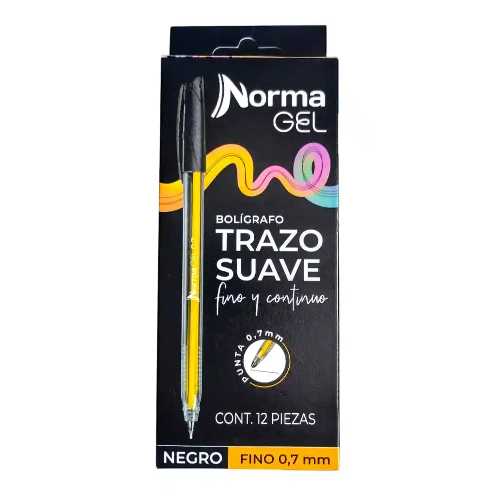 *Modelo: Norma Gel. *Color de tinta: Negro. *Punta: Fina de 0.7 mm. *Contenido: Caja con 12 piezas.
