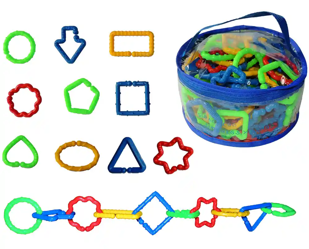 - Contenido: 80 eslabones plásticos - Tamaño: 7 x 7 cm. promedio. - Empaque: Estuche transparente con cremallera de 20 x 20 x 10 cm.