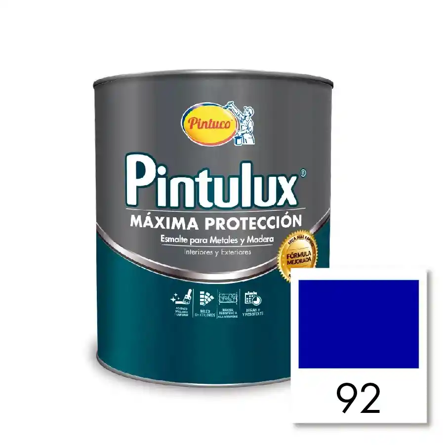intulux Máxima protección, es un esmalte alquídico diseñado para interiores y exteriores de excelente adherencia, durabilidad prolongada y máxima resistencia a la intemperie con un alto cubrimiento y buen rendimiento. Gracias a su fórmula brinda una nivelación superior dejando un acabado brillante y uniforme. Disponible en una amplia gama de colores. Producto formulado sin plomo ni cromo. USOS: Recomendado para proteger y decorar superficies y/o artículos de metal y madera en ambientes interiores y exteriores como estructuras metálicas, puertas, portones, ventanas, rejas, zócalos, muebles y marcos, etc. La imagen presenta una muestra aproximada del color real*
